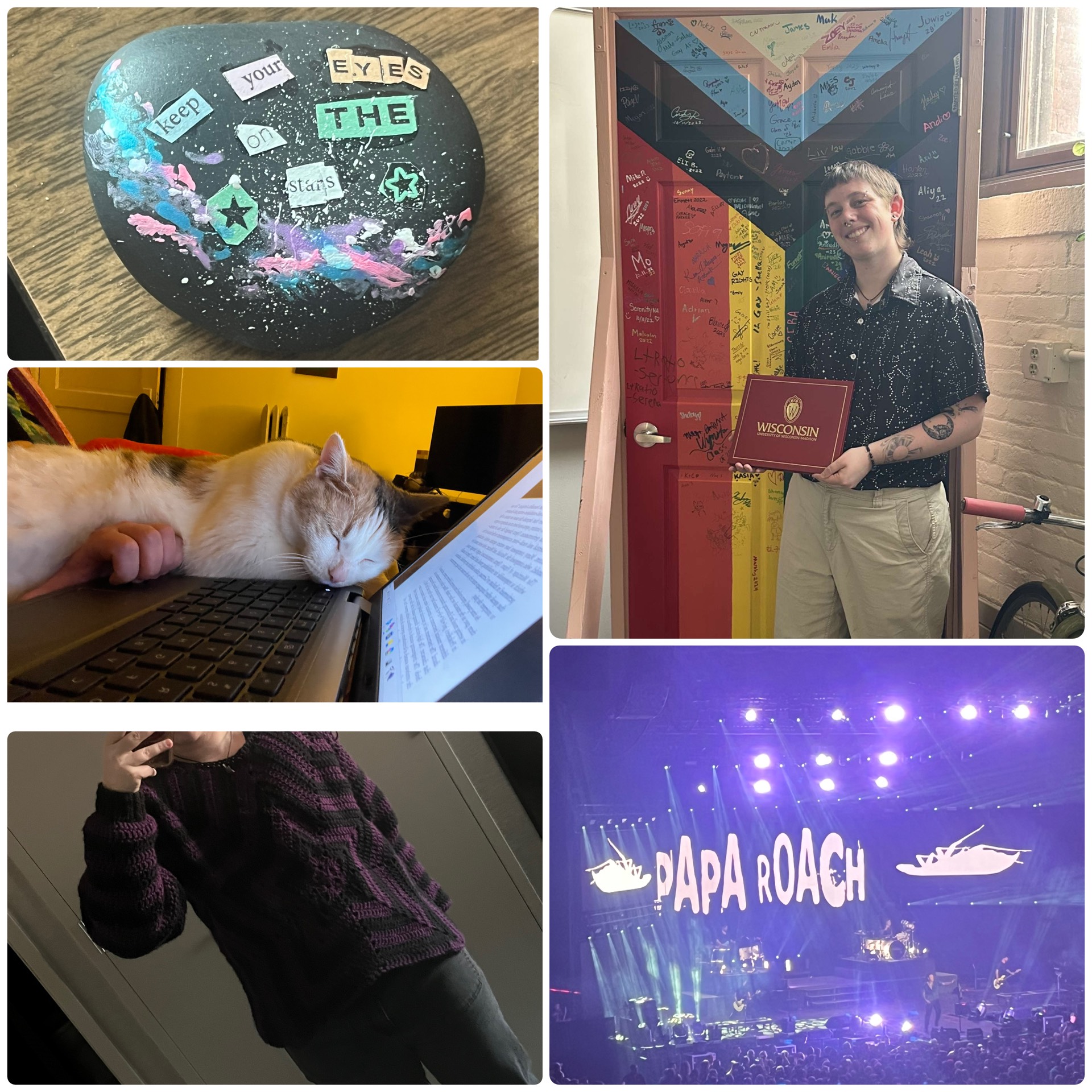 While I am the type of person to make astronomy my entire personality, I do have passions outside of academia. The image below displays some of my interests. As a kid, I was always into creating. When I wasn't being challenged academically, I could be found doodling in the margins of every notebook I owned. While I don't draw as often anymore, I still engage in other forms of art, as shown in the upper left ("Kindness Rock" that I painted recently in my craft group) and bottom left (my favorite crochet project to date) below. I also love that I get to make my own body into artwork through tattoos and piercings.